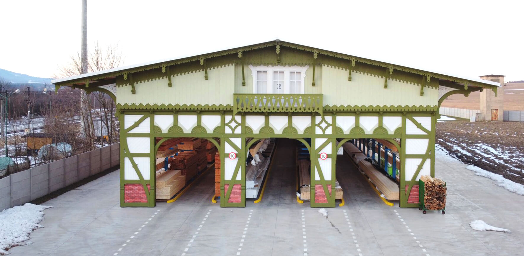Współczesna architektura przemysłowa w dużej mierze opiera się na zasadach wypracowanych przez modernizm: czystym funkcjonalizmie, maksymalnym uproszczeniu formy i rezygnacji z dekoracyjności. Na tym tle wyróżnia się nowa hala magazynowa firmy Odnova w Domaszkowie, której frontowa fasada nawiązuje do drewnianej architektury XIX wieku. Taki zabieg ma logiczne uzasadnienie — nie tylko przyciąga uwagę, lecz także informuje o profilu działalności przedsiębiorstwa, jakim jest handel drewnianymi elementami budowlanymi: