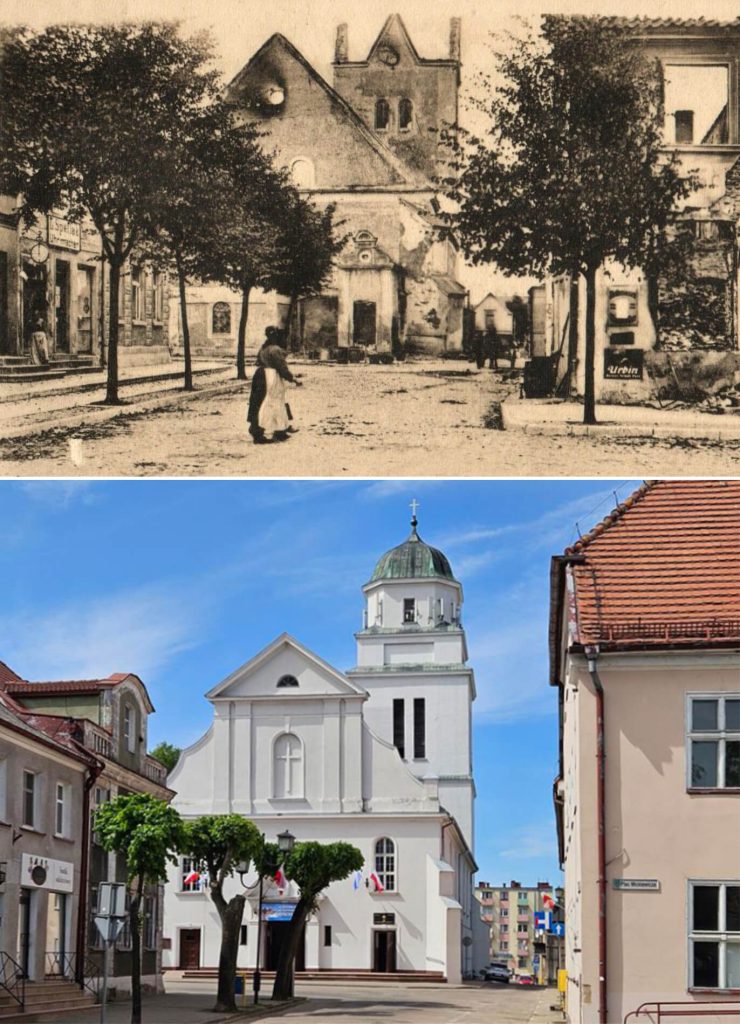 Kościół Podwyższenia Krzyża Świętego w Działdowie przed I wojną światową oraz obecnie (foto: W.Zalewski/fotopolska.eu)