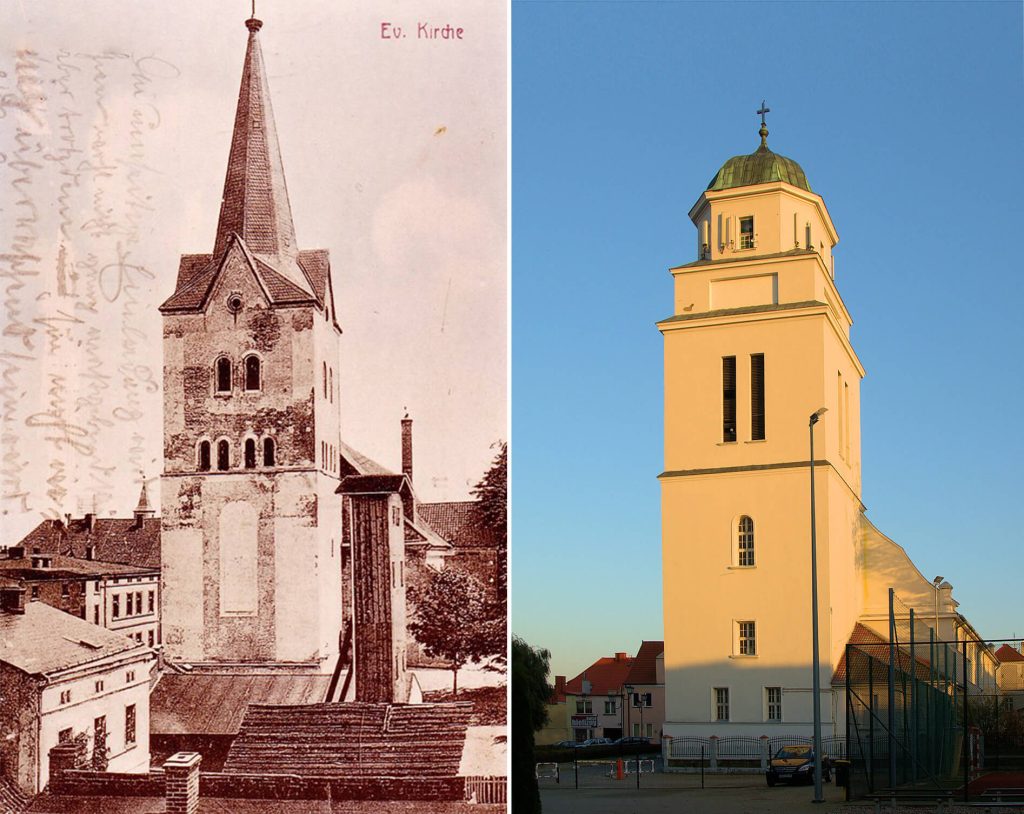 Kościół Podwyższenia Krzyża Świętego w Działdowie (od reformacji do 1981 roku ewangelicki) w roku 1914 oraz współcześnie (foto: zamki.rotmanka.com)