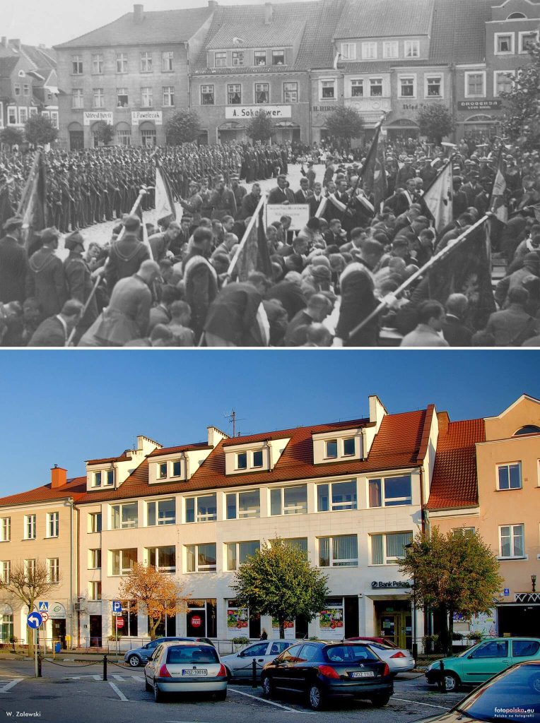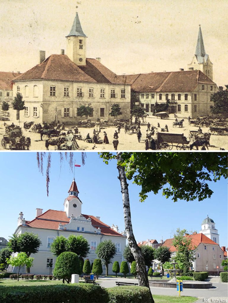 Dawny Rynek w Działdowie (obecnie Pl. Adama Mickiewicza) w roku 1899 oraz współcześnie (foto: Krzykos).