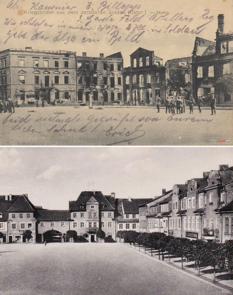 Zabudowa północno‑wschodniego narożnika Rynku w Działdowie w roku 1914 oraz w roku 1941.
