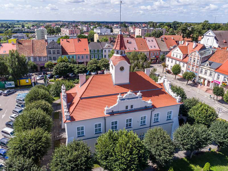 Odbudowa prowadzona w okresie międzywojennym nadała miastu nowe, polskie oblicze. Najważniejsze zabytki – ratusz i kościół – odtworzono w „stylu narodowym” („stylu polskim”). Ratusz w 1922 roku odzyskał wieżę, a dodatkowo wzbogacono go o neorenesansowe szczyty oraz nowe wejście boczne z balkonem i kolumnami.