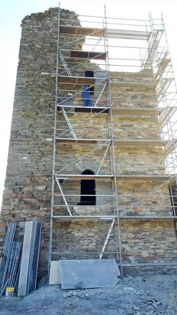 Wieża główna została całkowicie odbudowana i przystosowana do wydarzeń społecznych oraz kulturalnych. Cały proces wyróżniał się ogromnym udziałem lokalnych rzemieślników — około 90% prac wykonano siłami mieszkańców okolicznych miejscowości. Użyto lokalnego drewna kasztanowego, ręcznie kutego żelaza oraz kamienia z pobliskiej kamieniołomu w Villariños.