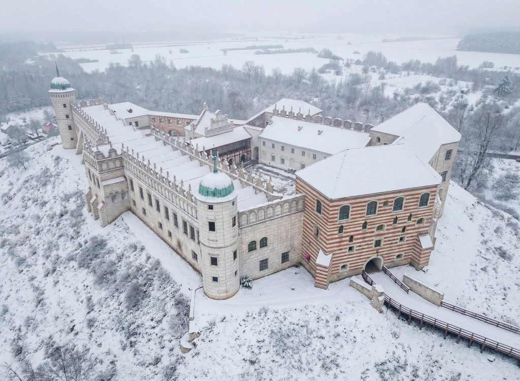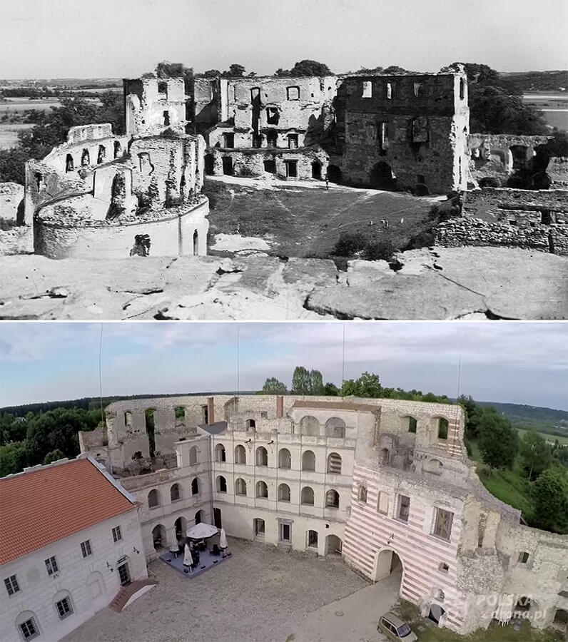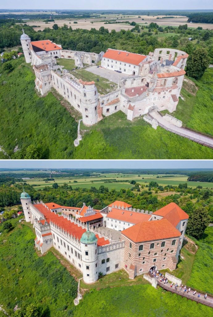 Poniżej prezentujemy próbę rekonstrukcji zamku wykonaną przy pomocy AI przez mgr inż. arch. Michała Szymankiewicza oraz historyczne fotografie dokumentujące przerwaną w latach 90. XX wieku odbudowę.