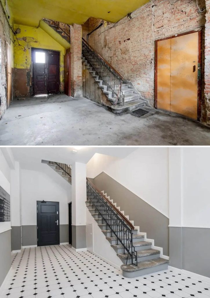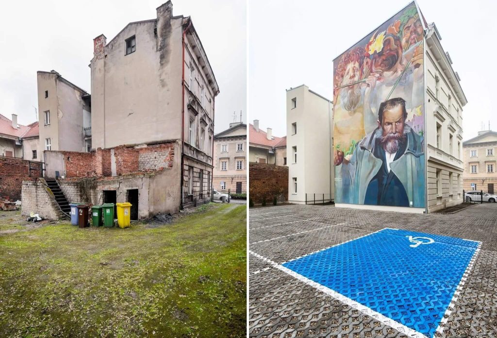 Cztery zestawienia zdjęć ukazują metamorfozę kamienicy przy ul. Łaziennej 15 w Kaliszu: front, klatka schodowa, drzwi oraz podwórko.
